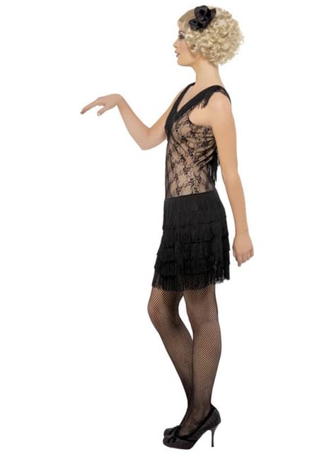 Includes a dress with black fringed skirt and lace on the top, and a headdress.
